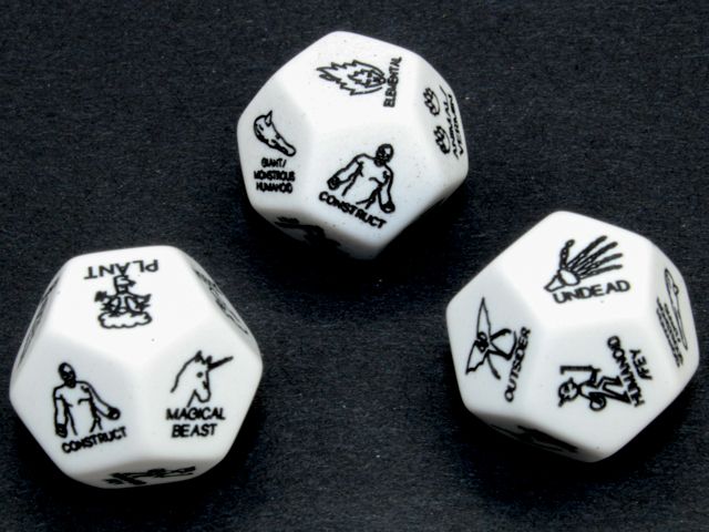 White 16mm 12-sided die with black words & icons, representing 12 choices for types of monsters or similar hazards in fantasy role-playing games such as Dungeons & Dragons.