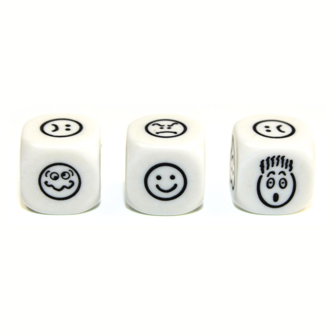 A single opaque white 6-sided die, with a variety of smiley-style icons depicting different facial expressions.