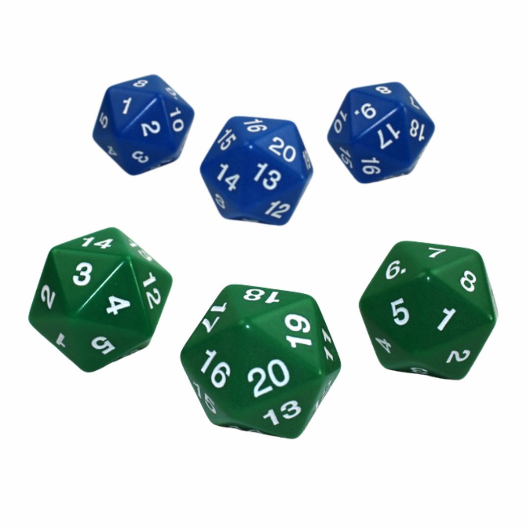 A single opaque 20-sided die in solid green or blue, with numbers in white. The numbers on these dice run sequentially adjacent to each other.